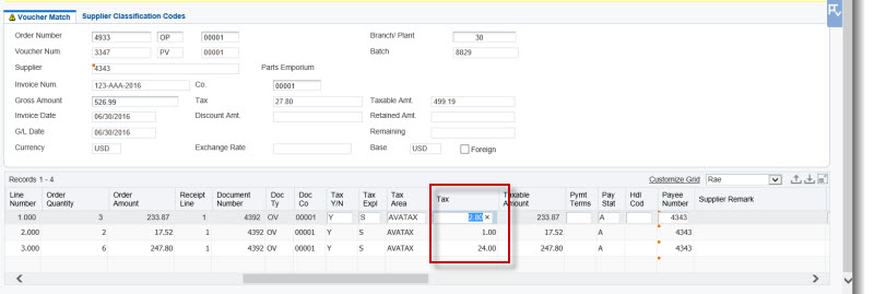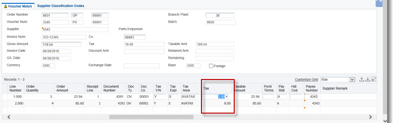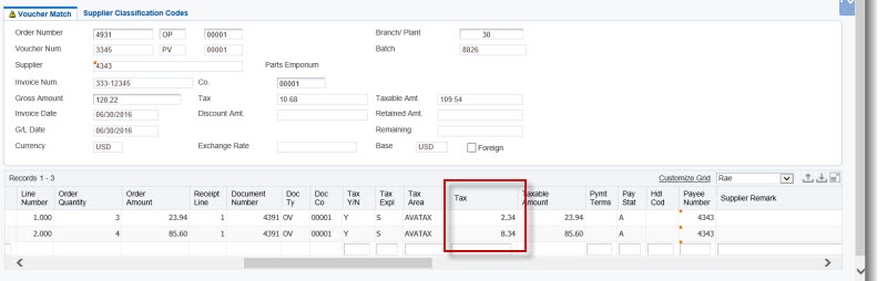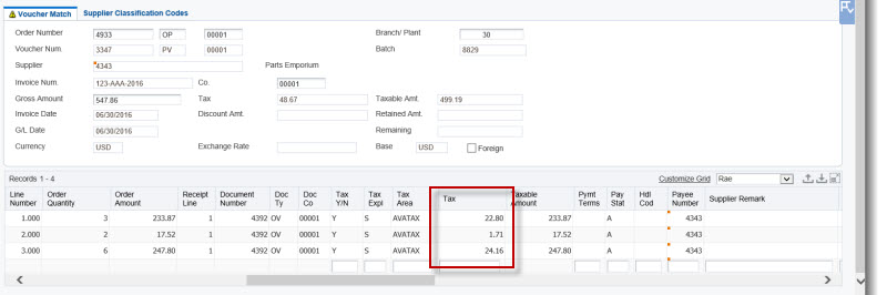 Now, enter the PO receipts and perform the voucher match. Ensure that the Tax column is visible during voucher match so that you may enter the actual tax based on the supplier's invoice if different than use tax calculated by AvaTax.