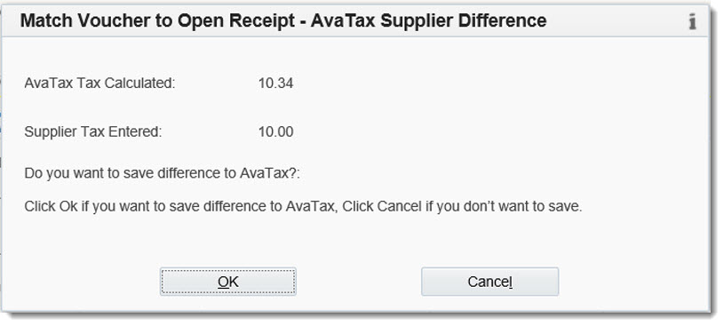 Due to fact that the tax calculated by Avalara AvaTax exceeds the tax reflected on supplier's invoice a pop-up notification will appear advising you that there is a difference in the tax estimated (if the tax reflected on supplier's invoice exceeds or is equal to tax calculated by Avalara AvaTax then no pop-up notification will appear). If the desire is to save the Use Tax difference to the AvaTax history click OK button, to ignore difference click on Cancel button.