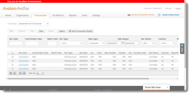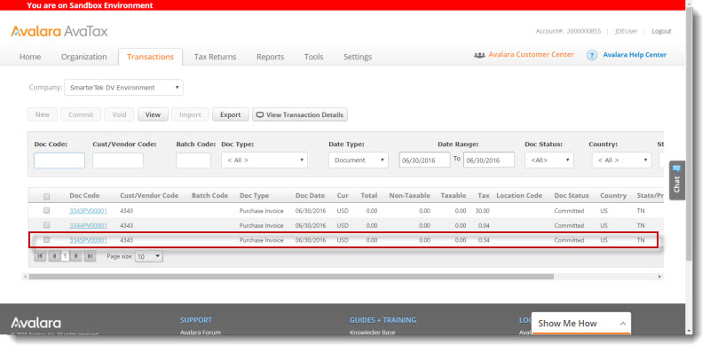 Once the voucher is saved, if desired, you can login to the Avalara AvaTax Administrator Console account to confirm the difference in tax for the transaction was written. Please note that the difference between the calculated tax and the tax reflected on supplier's invoice is recorded in Avalara AvaTax when the voucher is matched in JD Edwards and the difference was saved.