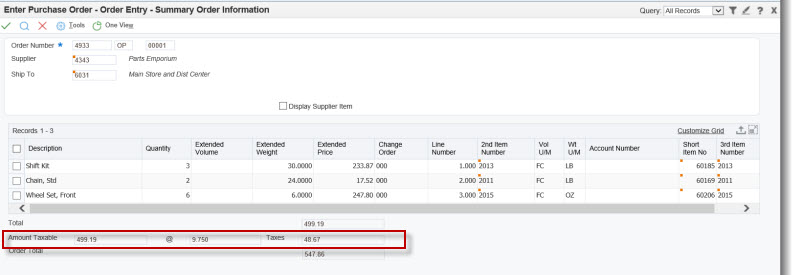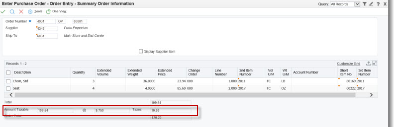 Once the purchase order has been saved you may use the Order Summary row exit to verify the estimated tax calculated.