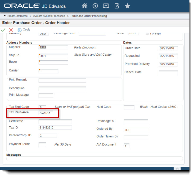 Once the purchase order has been saved you may use the Order Summary row exit to verify the estimated tax calculated by Avalara AvaTax.