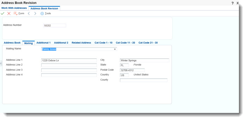 Return to Address Book Maintenance application and attempt to edit the address for the customer. Notice that all address fields are locked and cannot be edited. This is because logic has been added to disallow address maintenance when there are open sales orders (F4211.SDSHAN) for the ship to. The system considers an order open if the next status falls between the values set in constants ATNXTFROM and ATNXTTHRU. For more information on how to configure these constants please visit the Setup and Configuration section of this guide.