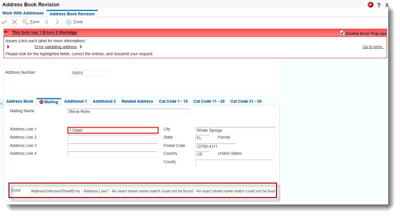 When an edit to an address is made in the Address Book (P01012) the address validation service will attempt to verify the address is complete and error free, only if Validate Address Service is active based on UDC Definitions within UDC 59 / AA - Address Validation Search Type and UDC 59 / AC - Address Country Validation. Currently Avalara validates addresses ONLY for USA and Canada.