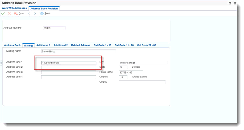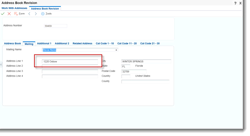 In JD Edwards Address Book edit a customer's address on the Mailing Tab. Notice Address 1 is 1220 Oxbow. Then, press OK.