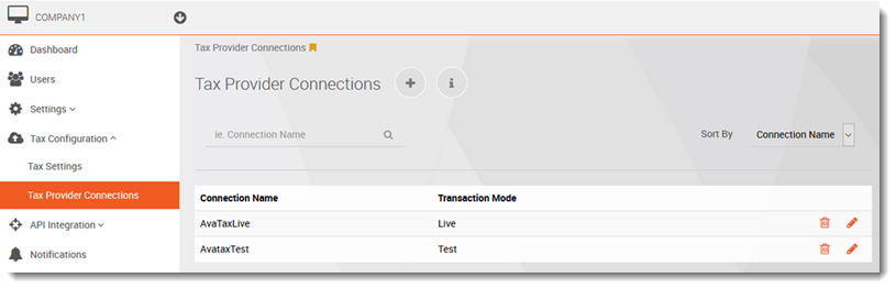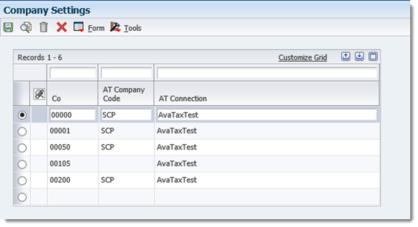 Within Company Settings application (PQ67ATSY) map each JD Edwards company which will calculate tax utilizing Avalara AvaTax Get Tax functionality to its respective Avalara AvaTax Company Code (A case-sensitive code that identifies the company in the Avalara AvaTax account in which the document should be posted. This code is declared during the company setup in the Avalara AvaTax Admin Console as shown above.) In addition, map each JD Edwards company to its respective Avalara AvaTax (AT) Connection Name created in the SmarterCommerce Tax Processing Console (A connection name defines the Avalara AvaTax Account and License to be utilized – see Avalara AvaTax (AT) Connections below.)