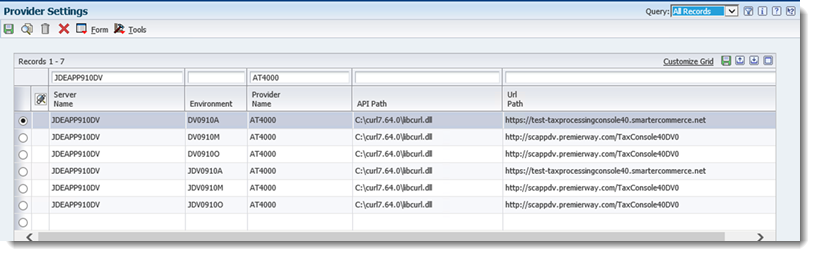 Within Company Settings (PQ67ATSY) take the form exit to Provider Settings and verify that provider settings have been configured based on provided installation guide recommendations, Server Name (the name of the server), Environment (the JDE Environment), Provider Name (must be “AT4000”), API Path (the path where the libCurl was installed), URL Path (Tax Processing Console URL). If provider settings seem to be missing or appear to be incorrect, please contact your system administrator. Avalara AvaTax Get Tax calculation will not function properly without appropriately configured provider settings.