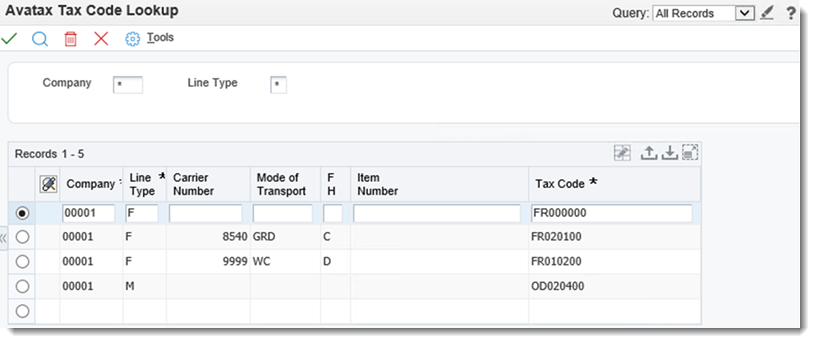 Within Company Settings application (PQ67ATSY) take the form exit to AT Tax Code. Tax codes are defined at the Item level and can be by Company, Line Type, Carrier Number, Mode of Transportation, Item Number.