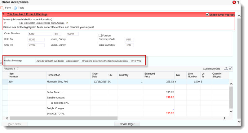 If no errors are encountered proceed to step 5 below; if an error is encountered you will receive an error message indicating the issue as seen below. In the middle of the screen the Avalara AvaTax Message will be displayed providing further details on the issue encountered.