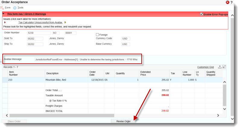 You must revise the order before it can be placed. To correct the issue press Revise Order.