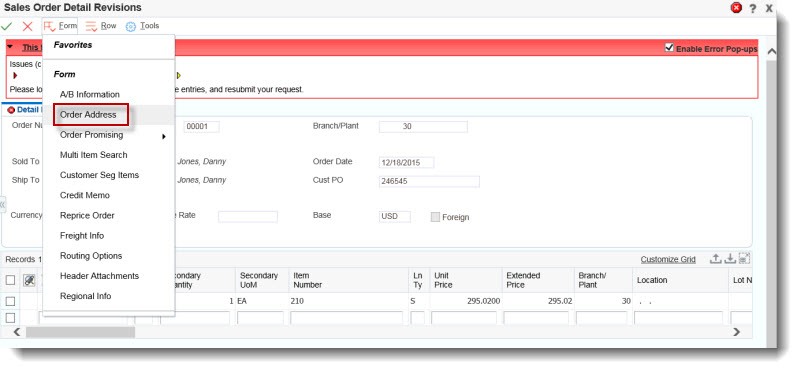 When an edit to a ship to address is made in the Sales Order Entry Address Override (P4006) application the address validation service will attempt to verify the address is complete and error free, only if Validate Address Service is active based on UDC Definitions within UDC 59 / AC - Address Country Validation. If any portion of the ship to address in order address override is invalid an error will be displayed on the Order Acceptance screen. This error must be corrected or Validate Address Service must be skipped (refer to Address Validation Service section of guide) before you can place the order.