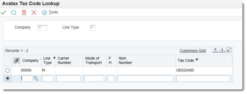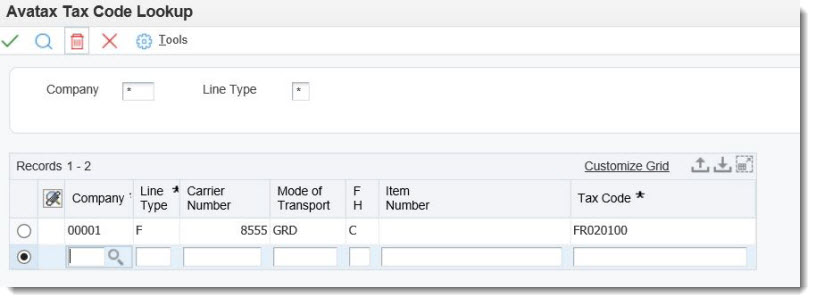 2. If no record is found, a fetch is executed using Company 00000, Order Line Level Line Type, Order Line Level Carrier, Order Line Level Mode of Transportation and Order Line Level Freight Handling Code. If a record is found, the TaxCode is retrieved and passed to Avalara AvaTax Get Tax calculation.