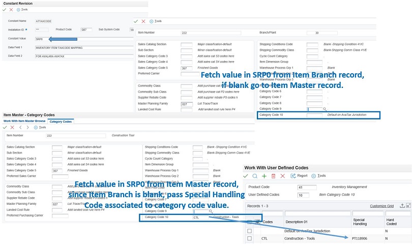 The SmarterCommerce Avalara AvaTax Connector passes the JD Edwards second item number (LITM) to the ItemCode field within the Get Tax calculation. The TaxCode related to the JD Edwards second item number is also passed and fetched from the item branch record category codes (F4102 - specific category code utilized is dependent on alias code setting within SmarterCommerce ATTAXCODE constant), if category code value in table is found <blank>, then value is fetched from the item master record category codes (F4101 - specific category code utilized is dependent on alias code setting within SmarterCommerce ATTAXCODE constant), and if category code value is still found <blank> then tax code is fetched based on AT Tax Code Definition form exit for a specific Company, Line Type, Carrier Number, Mode of Transport and Freight Handling Code as described below.