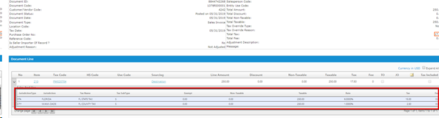 Note that the AvaTax Console shows the transaction detail. The sum of the document lines should match with the information printed in the invoice: