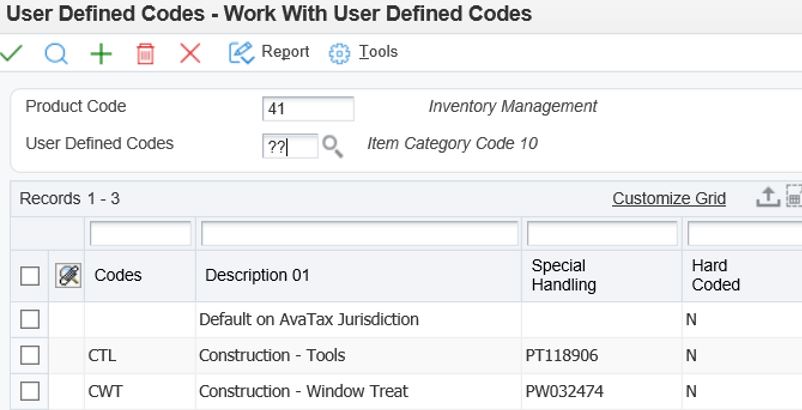 Avalara AvaTax Tax Code for Item - UDC: 41 / ?? (User Defined Code table is dependent on ATTAXCODE constant value setting)