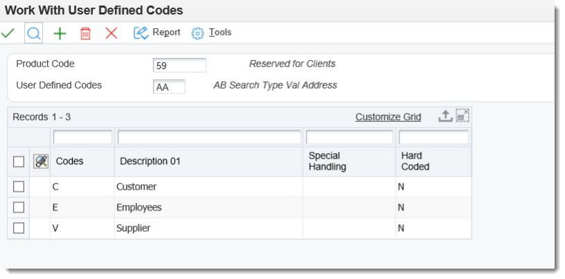 User Defined Code (UDC) table utilized to fetch tax code associated to JD Edwards second item number. Tax code is fetched from Special Handling Code field within the UDC table. Refer to Tax Code Definition section of guide for further explanation.
