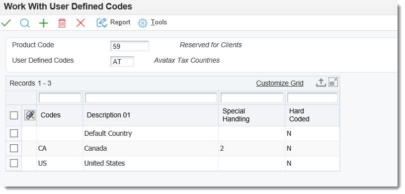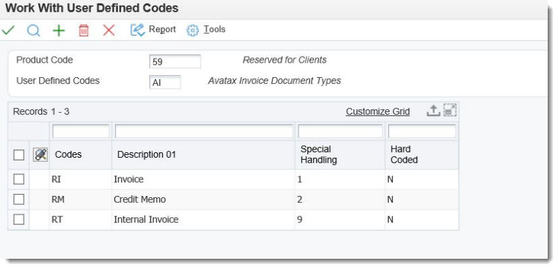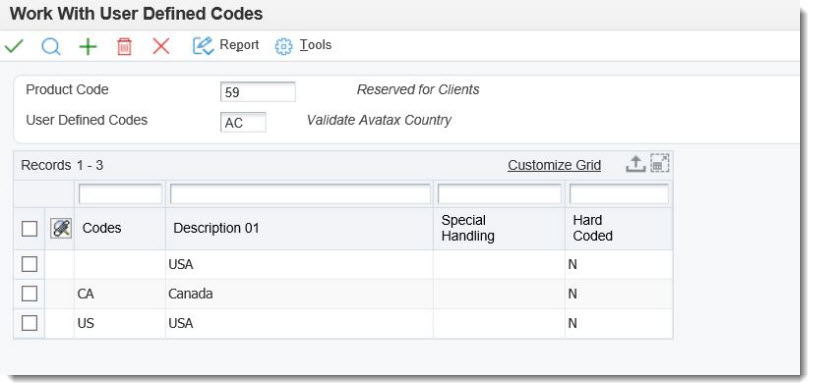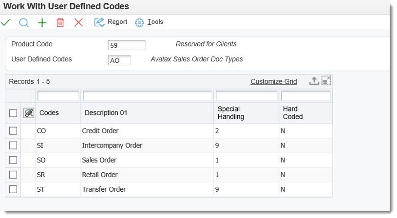 Within JD Edwards UDC application (P0004A) configure the following required User Defined Codes (UDCs) necessary for Avalara AvaTax Get Tax calculation.