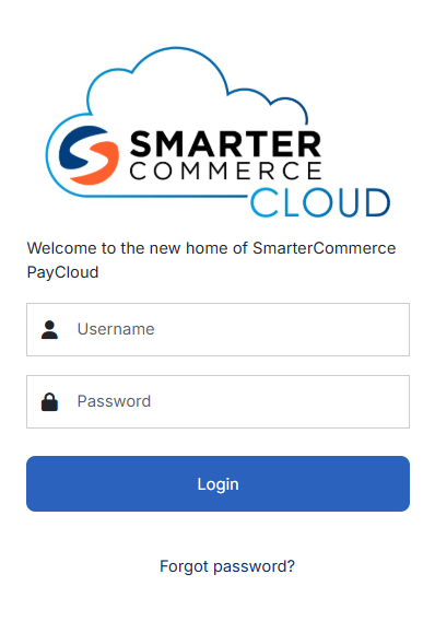 This is the SmarterCommerce PayCloud Console login screen. This system is designed to work with SmarterCommerce User authentication. This means you will use the username provided by either SmarterCommerce SERVICEplus or your company's local administrator (password is controlled by you) to login to your company workspace. If Multi-Factor Authentication (MFA) is enabled, you will also enter a secondary security code to login.